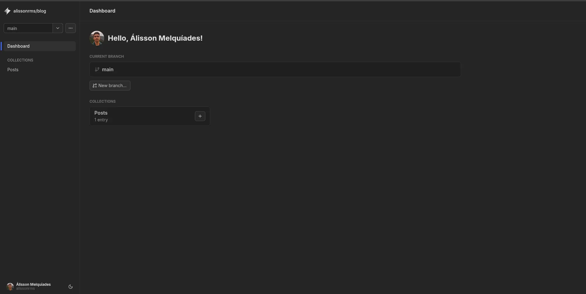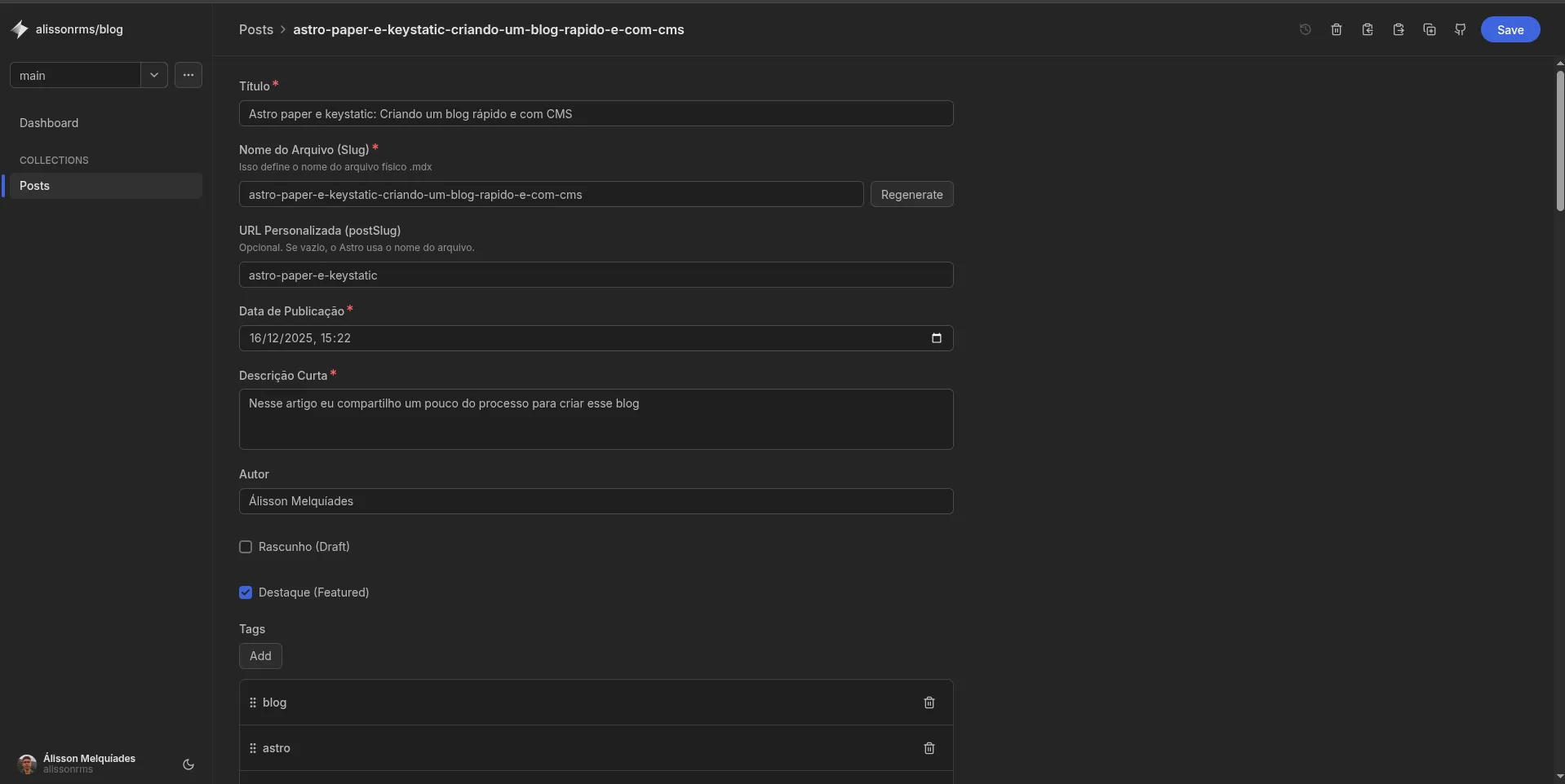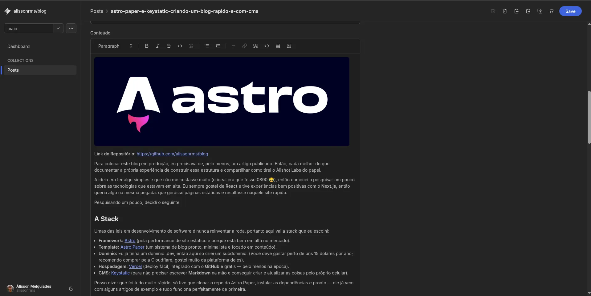 Agora o fluxo é simples: abro o painel do Keystatic (/keystatic) pelo próprio site, logo com meu github, escrevo o post ou edito o que quero editar, salvo e pronto, automaticamente o keystatic já dá um git push, a Vercel detecta a mudança e em menos de um minuto o site está atualizado.